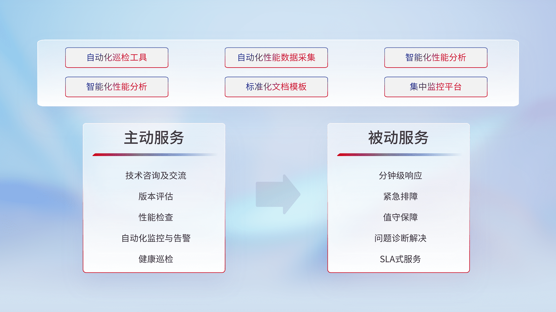 智能化工具和标准化文档,,,保障服务质量,,提供主动服务(包含技术咨询、、版本评估、、、性能检查、、、、自动化监控与告警、、、健康巡检)和被动服务包含(分钟级响应、、紧急排障、、、、值守保障、、、问题诊断解决、、SLA服务)。。